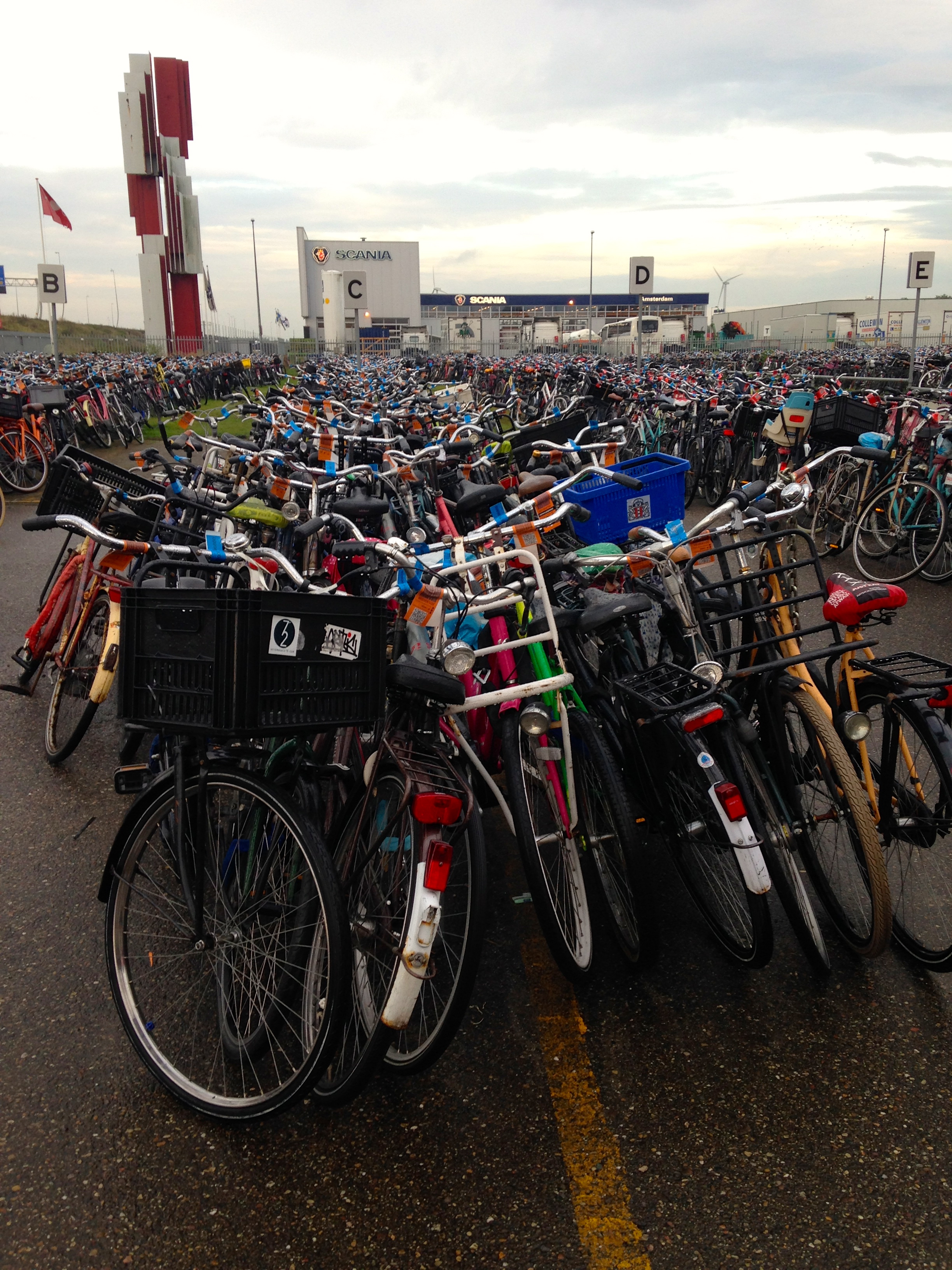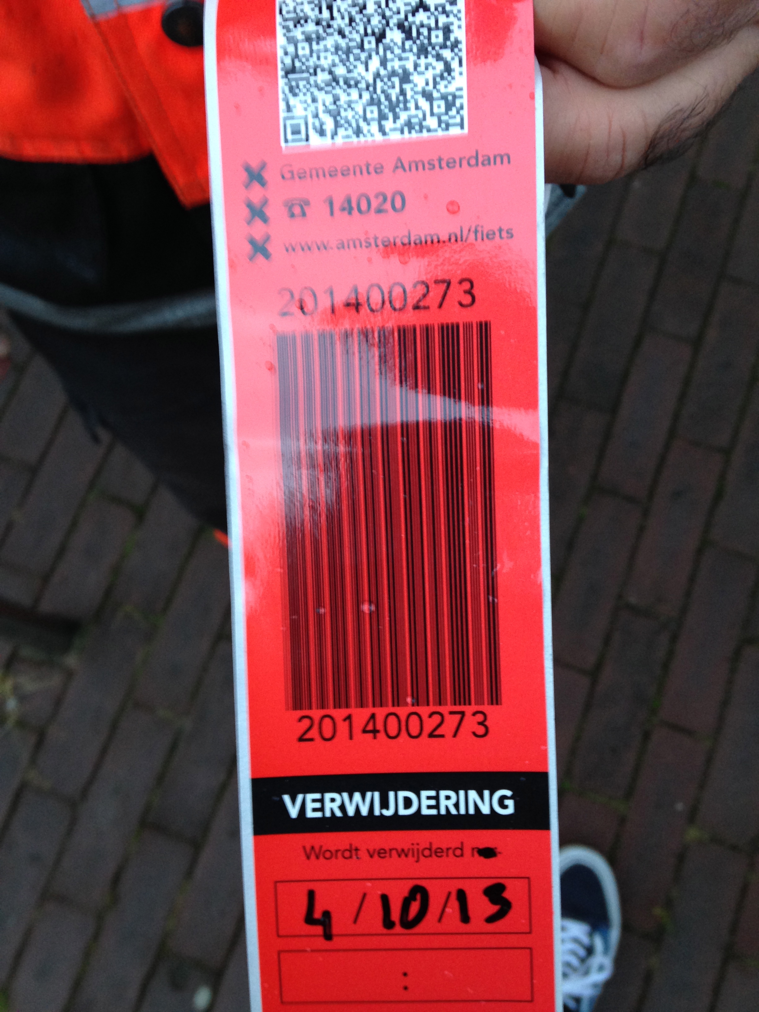 After loading the other nine bikes we drive to the ‘bike depot’, a huge terrain out of the city centre where at least a million bikes are stacked in long rows structured on alphabetic order. The super modern system fails when the bikes are handed over to the depot. Michael and Murat use a special computer to register the nine bikes, they print the credentials, and hand over the paper sheet to the depot manager. The depot uses the old system – blue stickers – thus someone else has to translate the Iphone system to the blue sticker system using the information on the print. While he is doing that, Michael, Murat, and I drink a coffee. We unload the nine bike and are off again, to our second task: ‘stickering’ and ‘tyrapping’ soon to be ‘orphan bikes’.